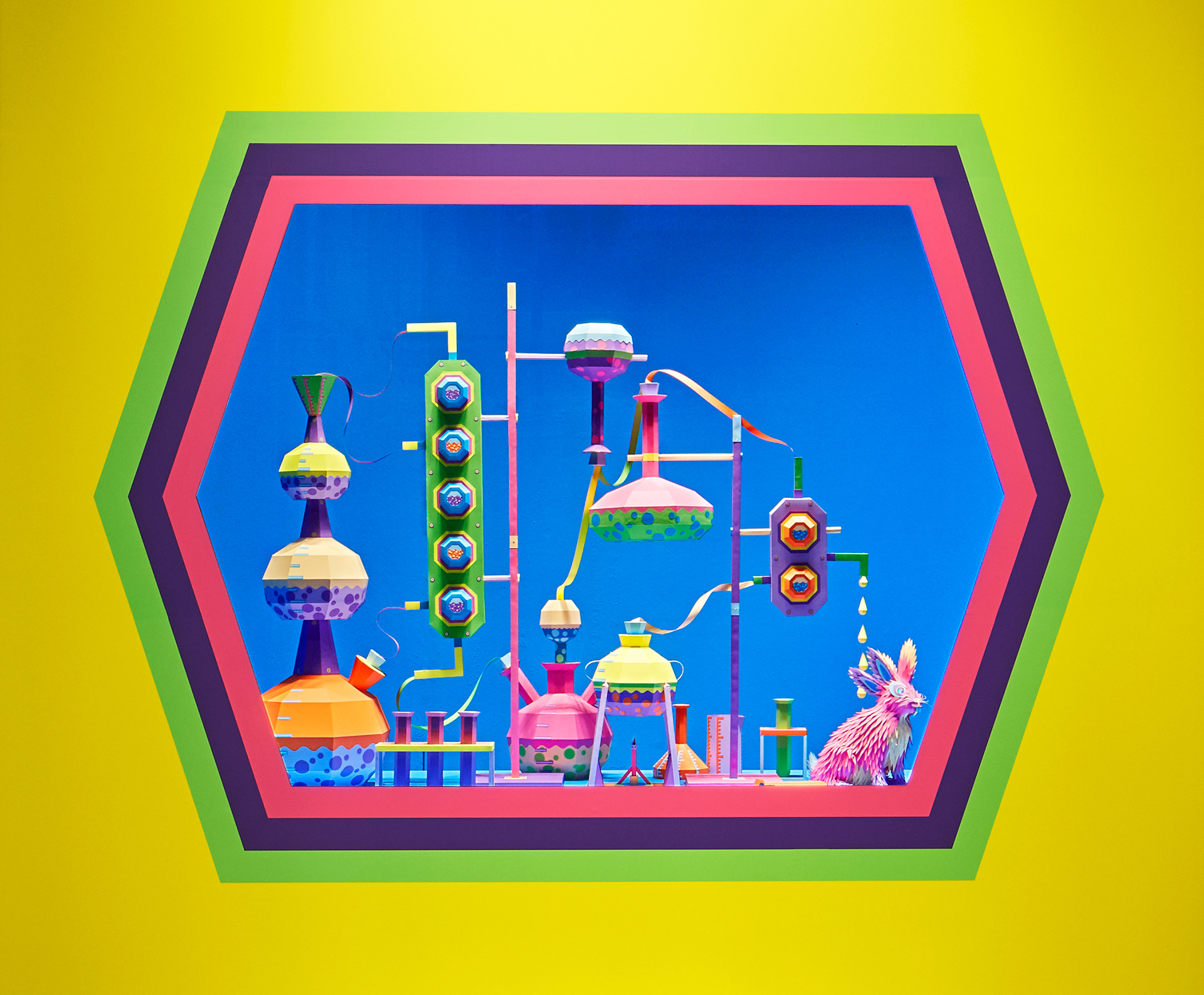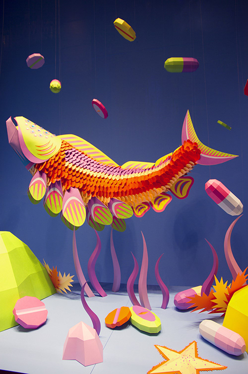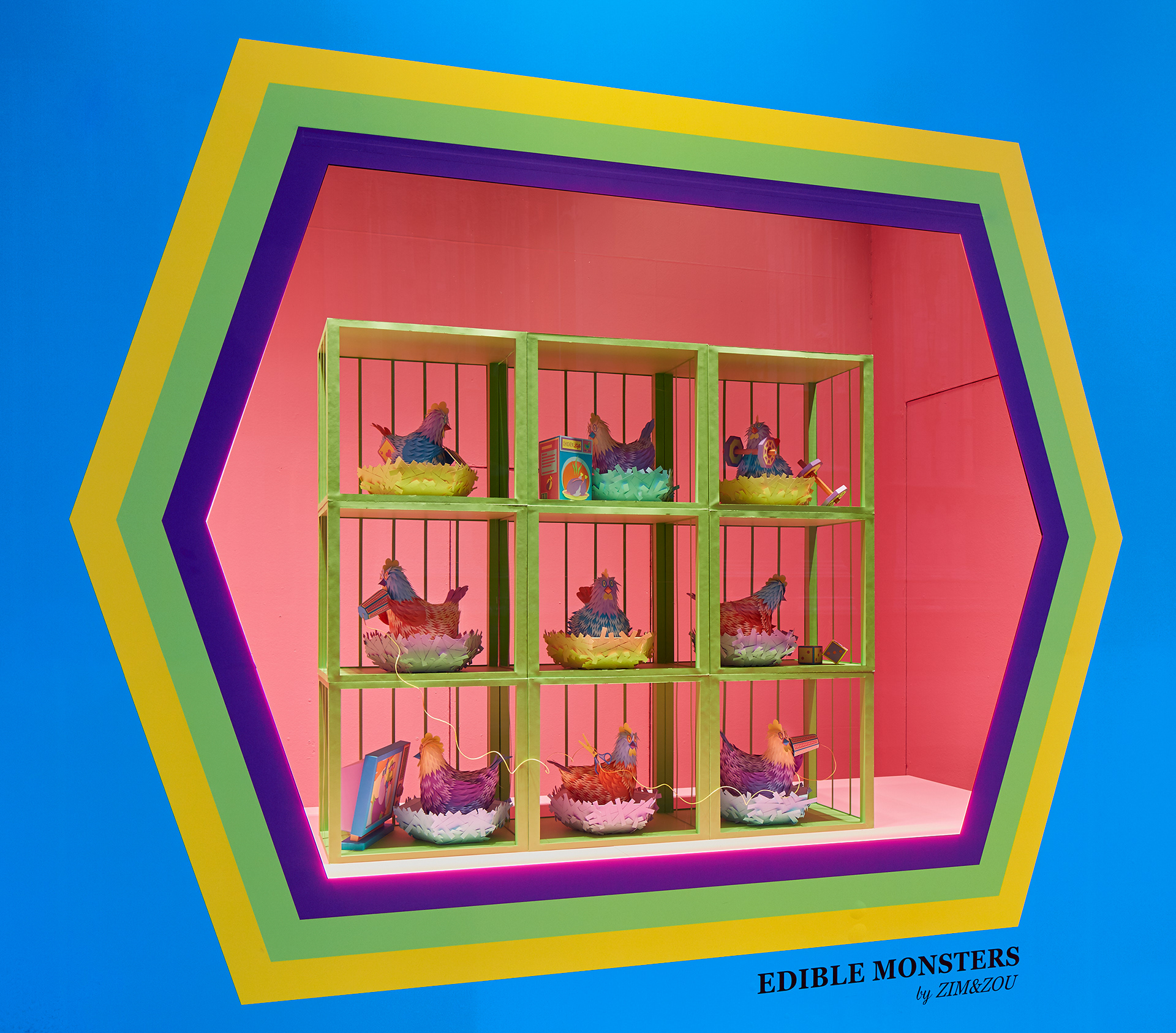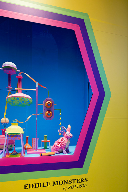 The authors are Zim&Zou, the creative French duo composed of Lucie Thomas and Thibault Zimmermann, who will illustrate in each window a precise modus operandi of the modern food industry creating a colourful paper universe, entirely made by hand.