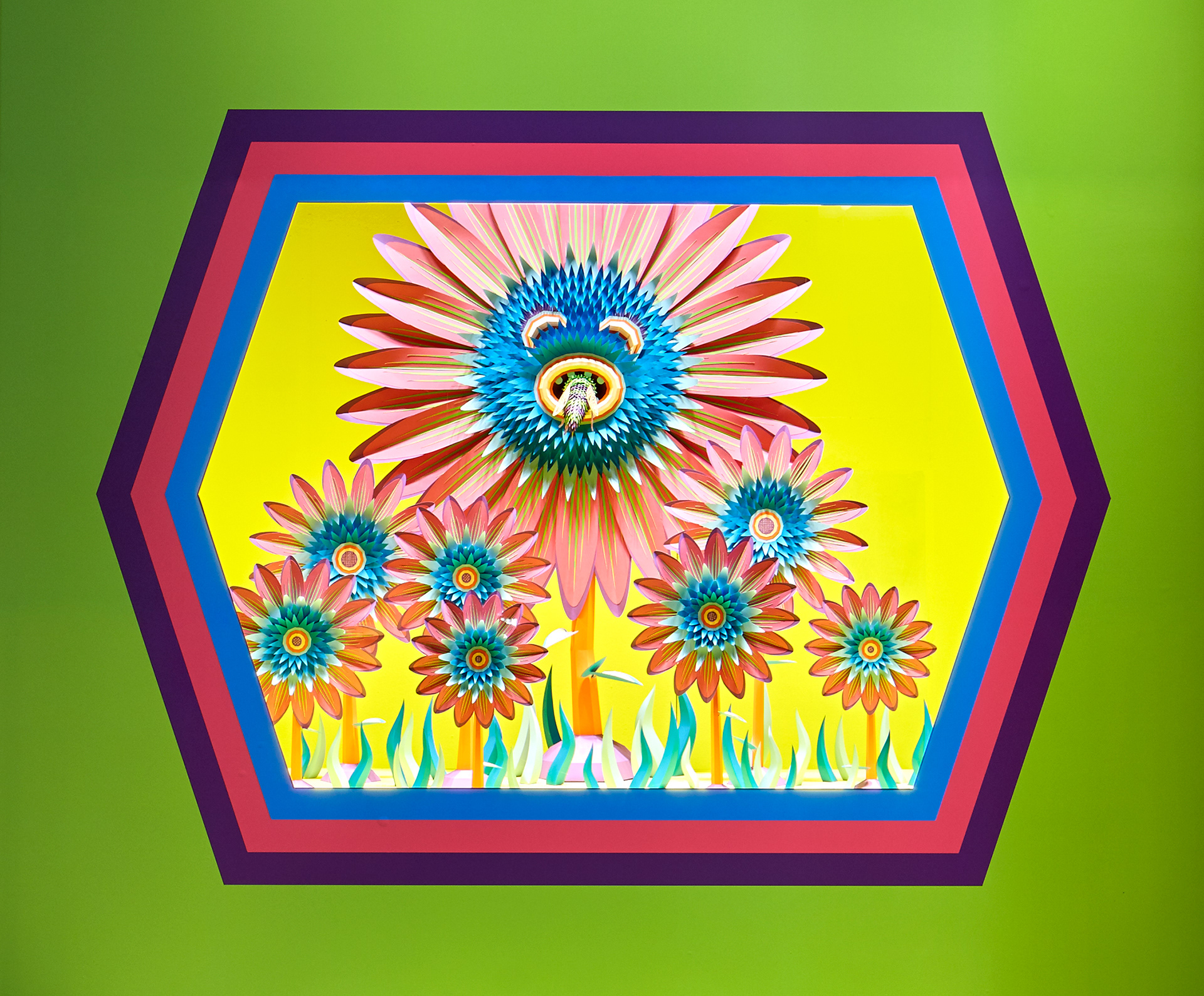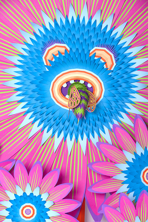 In a field of sunflowers, a mutant plant is devouring a bee, an insect that is crucial for its pollination and reproduction. All of this represents a monstrous act of self-defence as pesticides make plants immune to the attacks of insects but also expose them to their extinction by impeding nature to recreate its cycle.