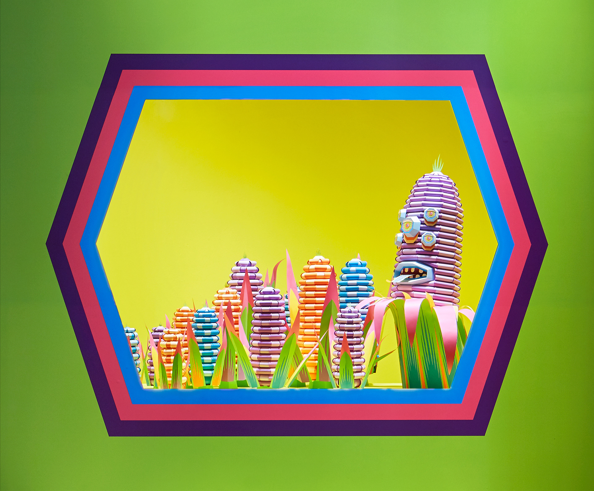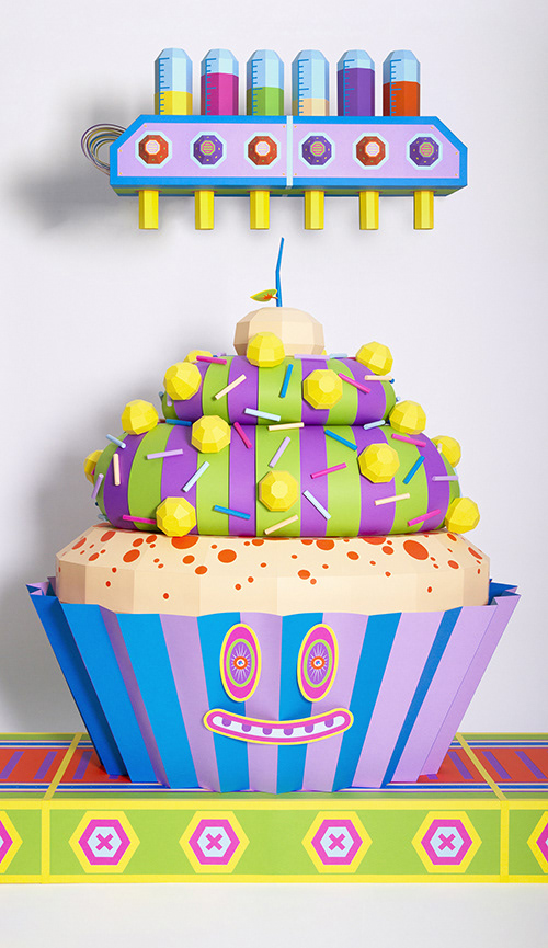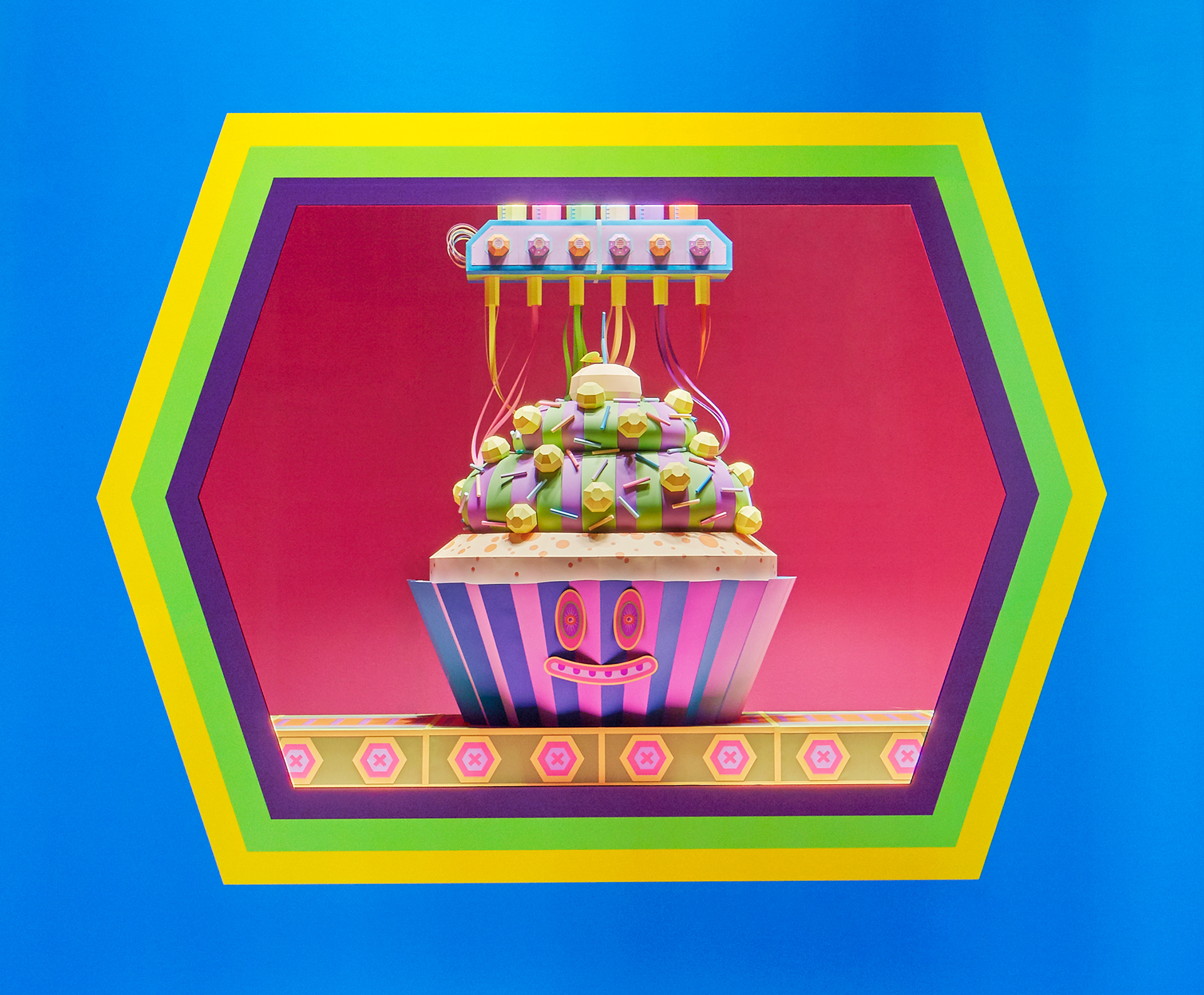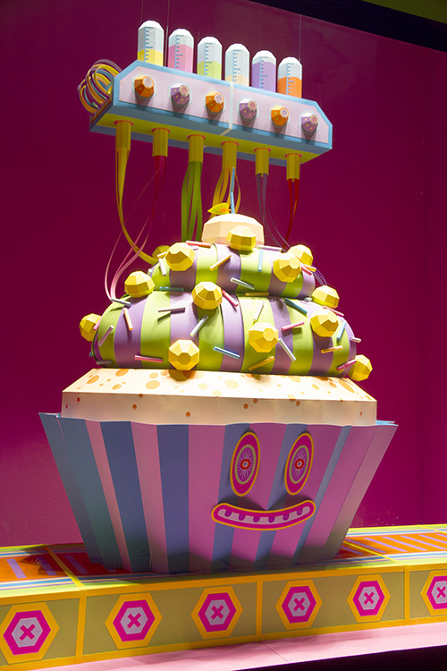 A 3D printer prints a cupcake using ink that is labelled edible. The cake slowly takes shapes and gives life to a strange character; thus raising the issue of its edibility. This window is clearly an invitation to reflect upon the chemical ingredients used by the industry.