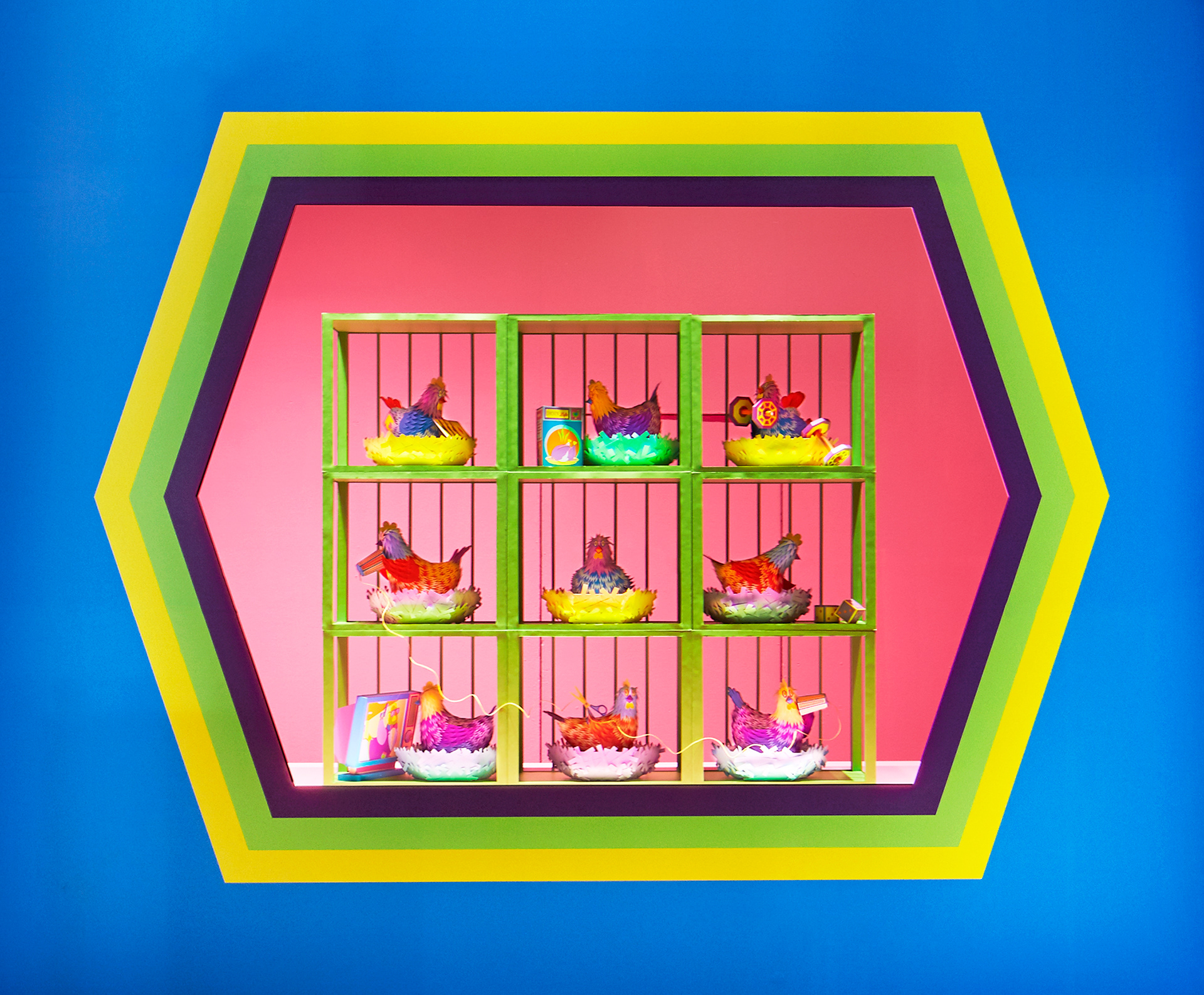 A bunch of cages make up a battery farm. The residents of this disturbing resort are chickens with human-like features. They do not live an exhilarating life: they cannot tell the difference between night and day and cannot completely open their wings. You will not fail to ask yourself some questions when looking at these small creatures with such a human-like appearance.